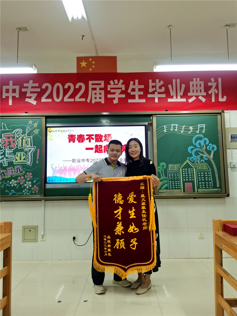 學生代表向班主任敬送題有“愛生如子,德才兼顧”的錦旗,并合影留念。學生代表發(fā)言,感恩母校三年的培育,感謝老師三年的教誨,感激同學三年的陪伴,將帶著對母校、老師、同學的那份眷念、不舍,勇敢地去迎接嶄新的生活。