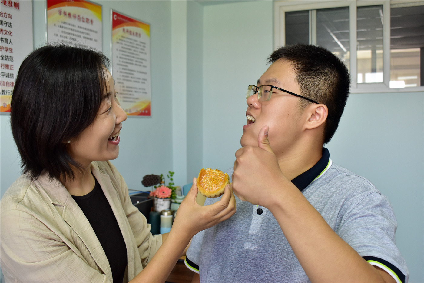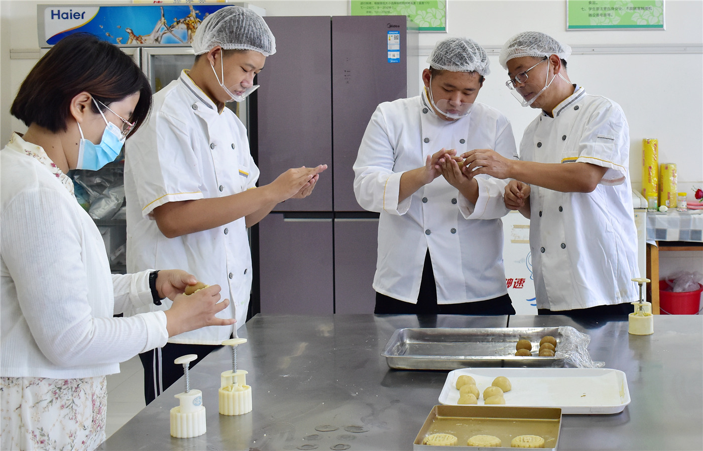 中秋節(jié)和教師節(jié)在2022年9月10日這天不期而遇,淄博市特殊教育中心新學(xué)年伊始的校園內(nèi)處處洋溢著濃濃的“團(tuán)圓”和“愛”的氛圍。在“雙節(jié)”前夕,學(xué)校根據(jù)聽障、視障、培智、康復(fù)、職教學(xué)生的不同特點(diǎn),從傳承中華民族優(yōu)秀傳統(tǒng)文化,愛黨愛國教育,培育新時(shí)代文明家風(fēng)、倡導(dǎo)社會(huì)和諧文明風(fēng)尚等方面開展了主題鮮明、形式各異、豐富多彩的一系列活動(dòng)。 學(xué)校職教烘焙專業(yè)的學(xué)生們在老師的帶領(lǐng)下,親手制作著月餅。老師一邊講解月餅的制作工序,一邊介紹中秋節(jié)的由來風(fēng)俗。學(xué)生們在感嘆中國傳統(tǒng)節(jié)日文化博大精深的同時(shí),更加專注認(rèn)真,因?yàn)樗麄円糜H手制作的月餅在教師節(jié)給老師們送上誠摯的祝福。你一口,我一口,唇齒間品嘗的不僅僅是象征團(tuán)圓美滿的月餅,更是溫馨甜蜜濃濃的師生情。