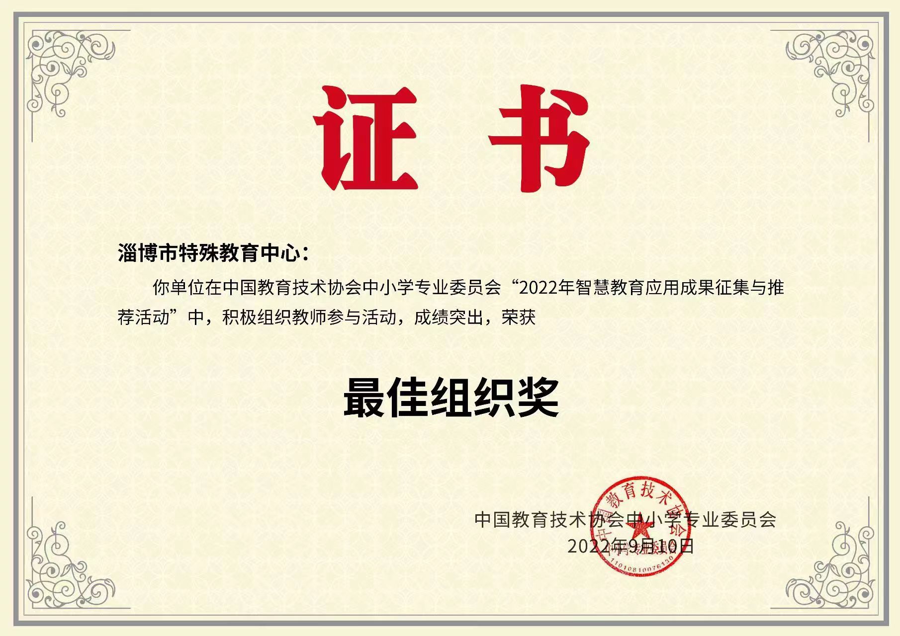 近日,從中國教育技術(shù)協(xié)會中小學(xué)專業(yè)委員會傳來捷報,淄博市特殊教育中心榮獲“2022 年智慧教育應(yīng)用成果征集與推薦活動最佳組織獎單位”。