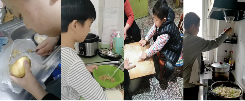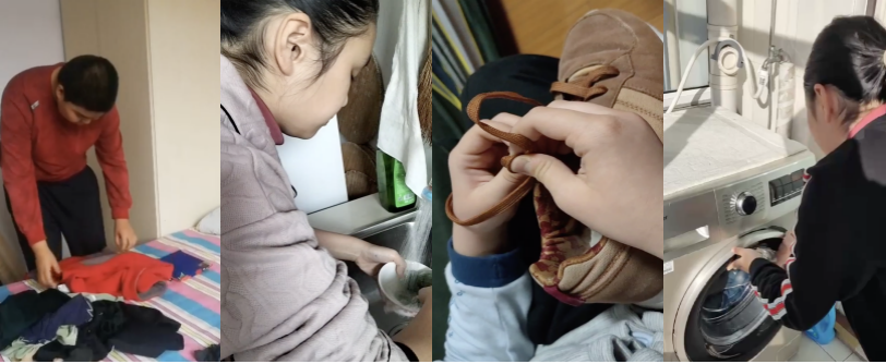 在生活適應(yīng)、勞動(dòng)技能教師的指導(dǎo)下,培智低年級(jí)段同學(xué)從實(shí)際生活出發(fā),展示了洗臉、刷牙等自理技能,實(shí)現(xiàn)了自助、自立,增強(qiáng)了自我成就感。中年級(jí)段同學(xué)借助課上學(xué)習(xí)的本領(lǐng),幫父母打掃衛(wèi)生、整理物品、洗衣服、疊衣服、系鞋帶等,用自己質(zhì)樸的行動(dòng)回饋父母無私的愛。高年級(jí)段同學(xué)化身“美食小達(dá)人”,走進(jìn)廚房,大展才藝,親自動(dòng)手體驗(yàn)做飯的樂趣。和面、搟面、包水餃,洗菜、切菜、炒菜……大家干勁十足,品嘗到甜蜜勞動(dòng)果實(shí)的同時(shí),收獲了成長(zhǎng)的幸福。活動(dòng)中,學(xué)生不僅幫父母切實(shí)減輕了家務(wù)負(fù)擔(dān),也鍛煉了自己的身體和本領(lǐng),為居家學(xué)習(xí)創(chuàng)造了舒適溫馨的環(huán)境。