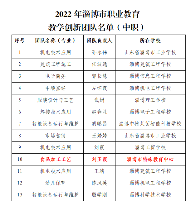 ? 近日,淄博市教育局下發(fā)了《關(guān)于公布2022年淄博市職業(yè)教育教學(xué)創(chuàng)新團(tuán)隊名單的通知》,淄博市特殊教育中心劉玉霞老師帶領(lǐng)的食品加工工藝團(tuán)隊(專業(yè))成功入選。此次評選,共遴選出中等職業(yè)學(xué)校教學(xué)創(chuàng)新團(tuán)隊13個,高職院校教學(xué)創(chuàng)新團(tuán)隊12個。