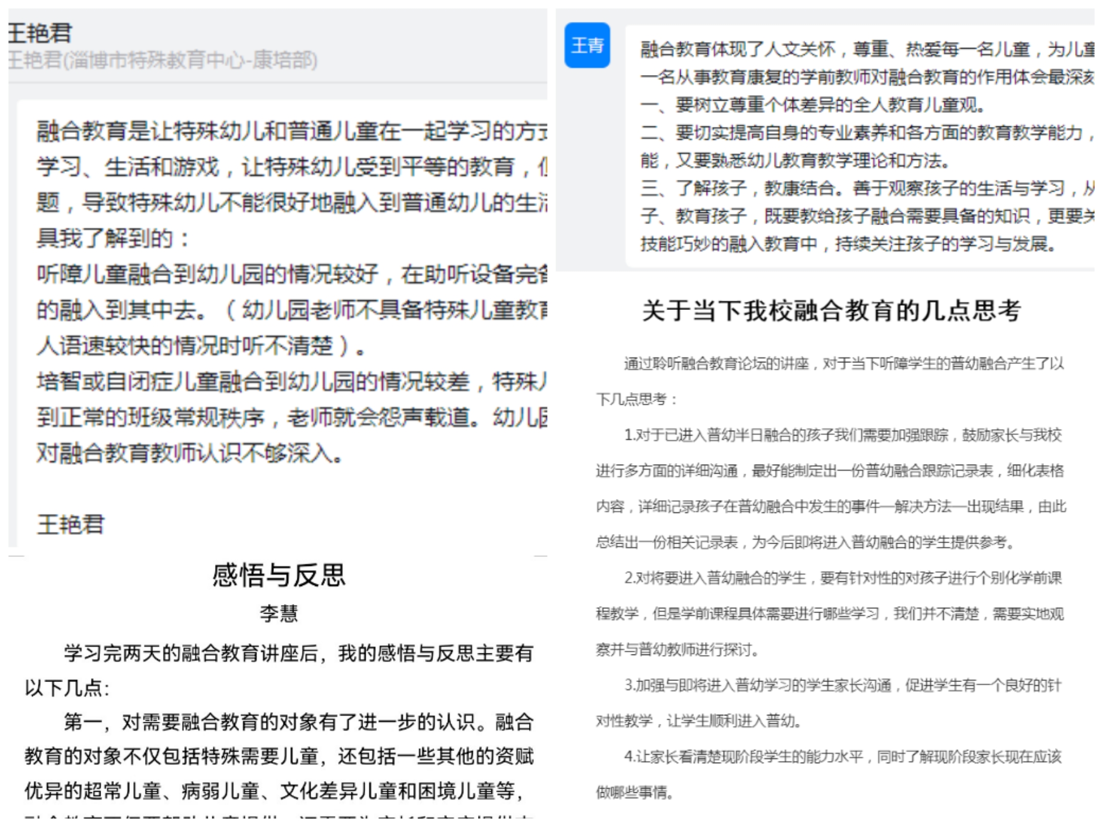 本著“有疑必論,有策共享”的精神,教師們在觀看完直播后積極探討,多思妙想,撰寫學習心得體會,為學校學前融合教育的發(fā)展獻計獻策。竭盡全力給特殊兒童一個完整的童年,已成為老師們的共同心聲。