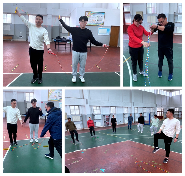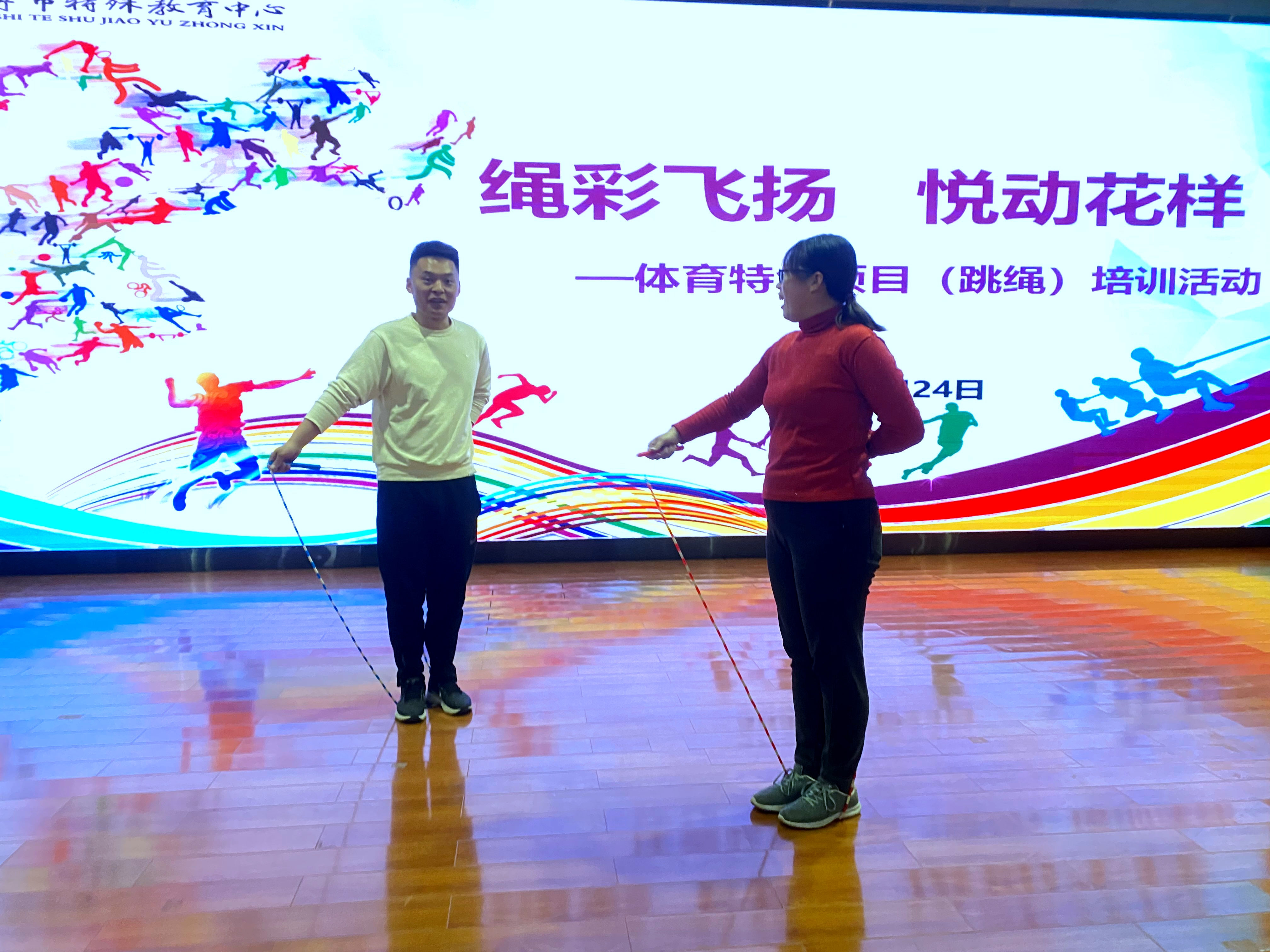 講座結束后,體育教師們來到體育館,對講座內容進行集體學練,通過親身試跳、相互交流,共同探討適宜特需學生學習鍛煉的跳繩類別和形式,為接下來的教學開展提供思路、打好基礎。