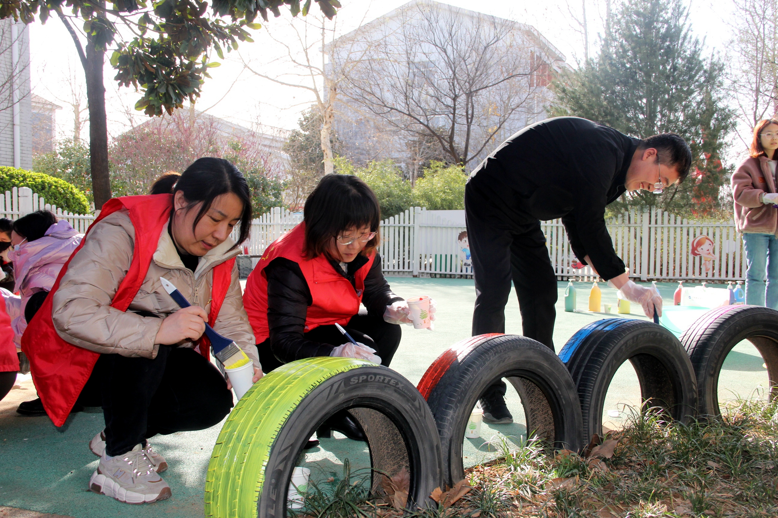 第三黨支部開展“三提三爭 創(chuàng)優(yōu)增‘彩’”美化校園志愿活動,全體黨員身著志愿者紅馬甲,手持水彩、畫筆,發(fā)揮巧思妙想,將單調(diào)破舊的黑輪胎,變成了色彩繽紛、富有童趣的裝飾品,點亮了春日校園,豐盈了兒童樂園。