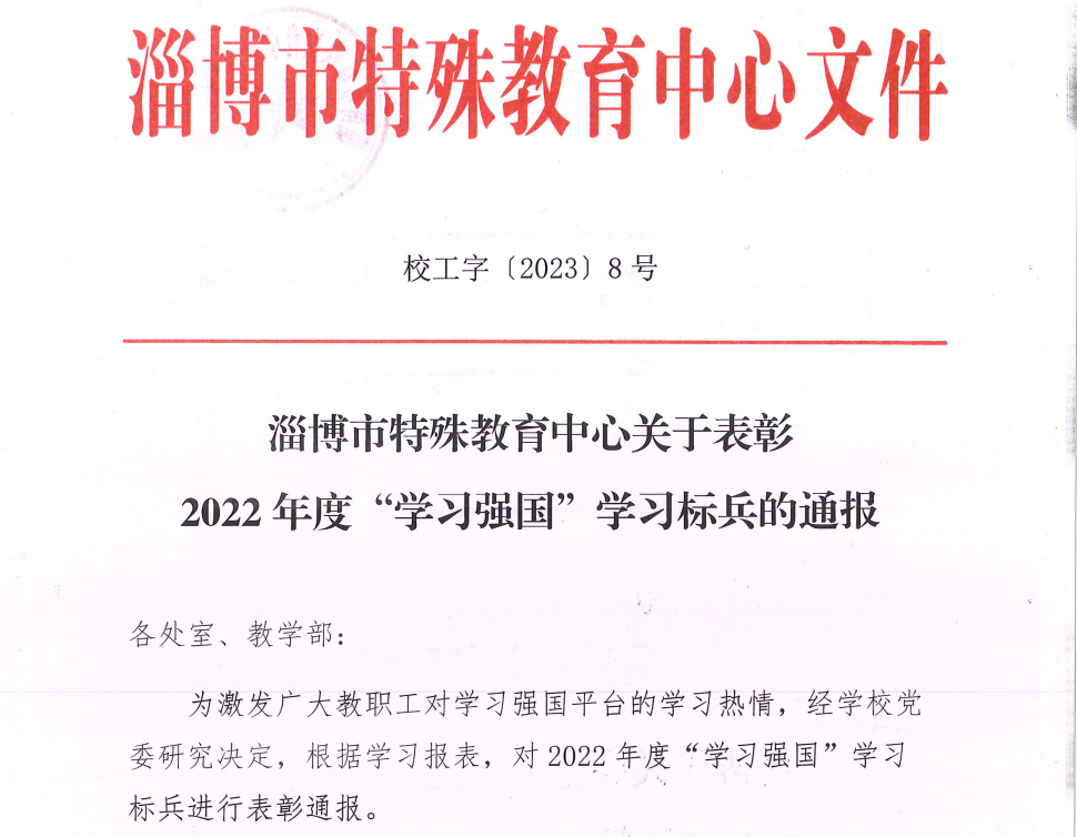 近日,淄博市特教中心對2022年度獲得學?!皩W習強國”學習標兵的老師進行了表彰獎勵。