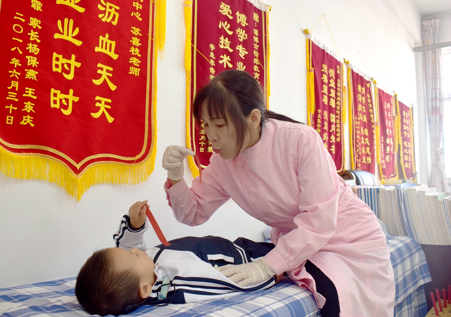亦師亦母,亦子亦生。入學初,擔任盲一年級班主任、語文教學和高中英語教學工作的蘇老師經(jīng)常為拉尿到褲子里的孩子換洗衣服、洗澡。孩子們生病了,多次騎著自行車帶著孩子去醫(yī)院打吊瓶,端水喂藥、接尿。周末,帶孩子到家吃水餃,給孩子們過生日.....