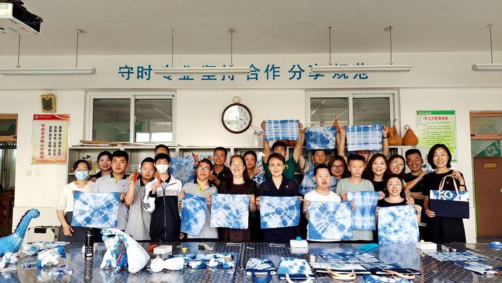 方巾、束口袋、帆布包……各種潔白的布料和靛青色的染料展現(xiàn)著扎染工藝的魅力與趣味。扎染老師首先就扎染的歷史及制作工藝進(jìn)行了詳細(xì)的講解。實操環(huán)節(jié)中,師生根據(jù)自己的想象設(shè)計圖案,通過橡皮筋、夾子、木筷等材料對染布進(jìn)行捆扎造型,經(jīng)過浸泡上色、固色、清洗之后,一件件暈色豐富,變化自然的扎染作品映入眼簾。