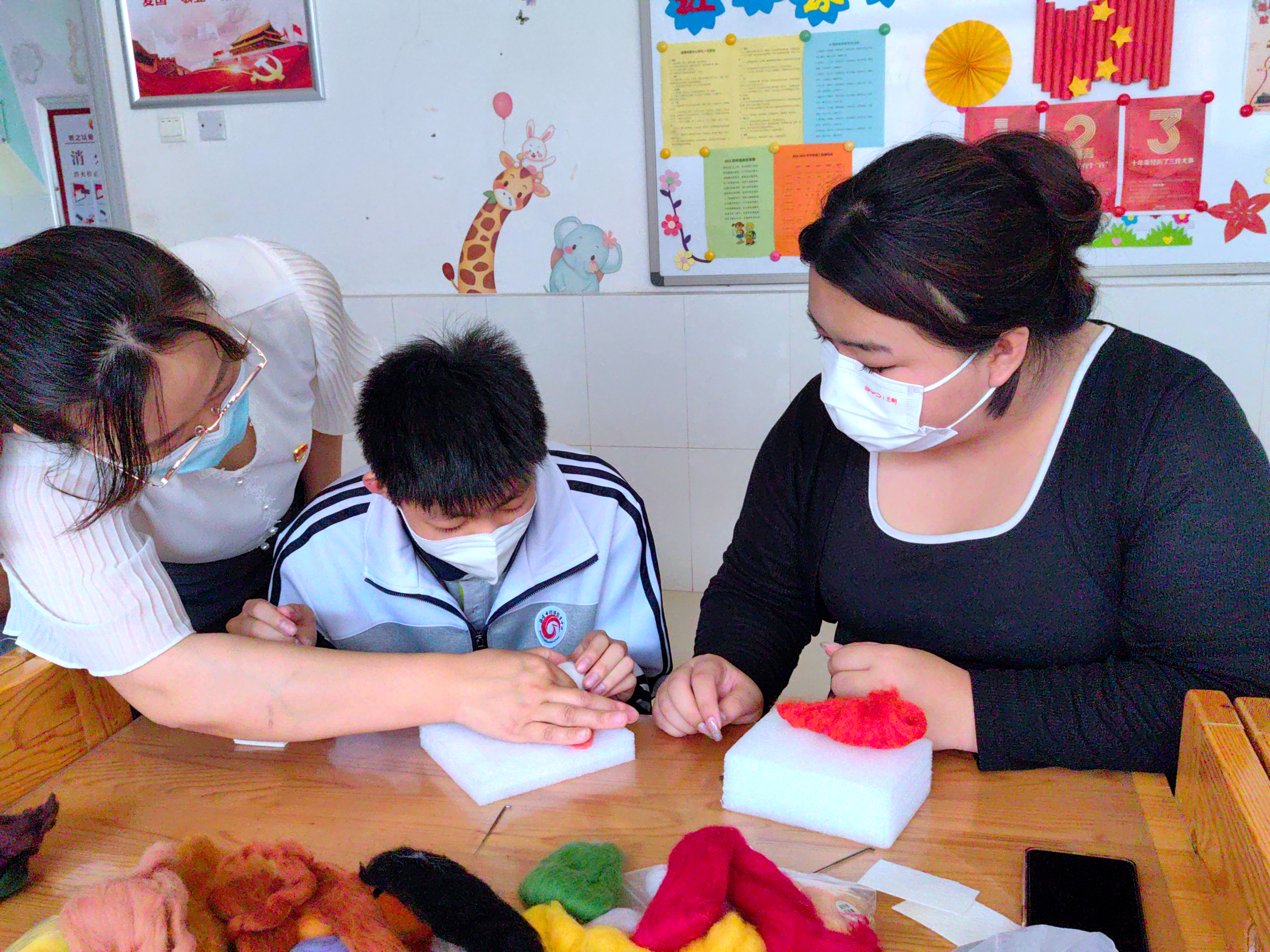 羊毛氈是采用純天然的羊毛制作而成,是目前最古老的織品形式之一。活動開始,老師介紹了毛氈作品及其創(chuàng)作步驟,以針氈為主要手段,輔之以羊毛戳針戳刺羊毛,使羊毛相互糾結(jié)纏繞,達(dá)到沾化效果。手作毛氈對于促進(jìn)學(xué)生精細(xì)動作的協(xié)調(diào),培養(yǎng)學(xué)生的想象力和創(chuàng)造力具有重要作用。