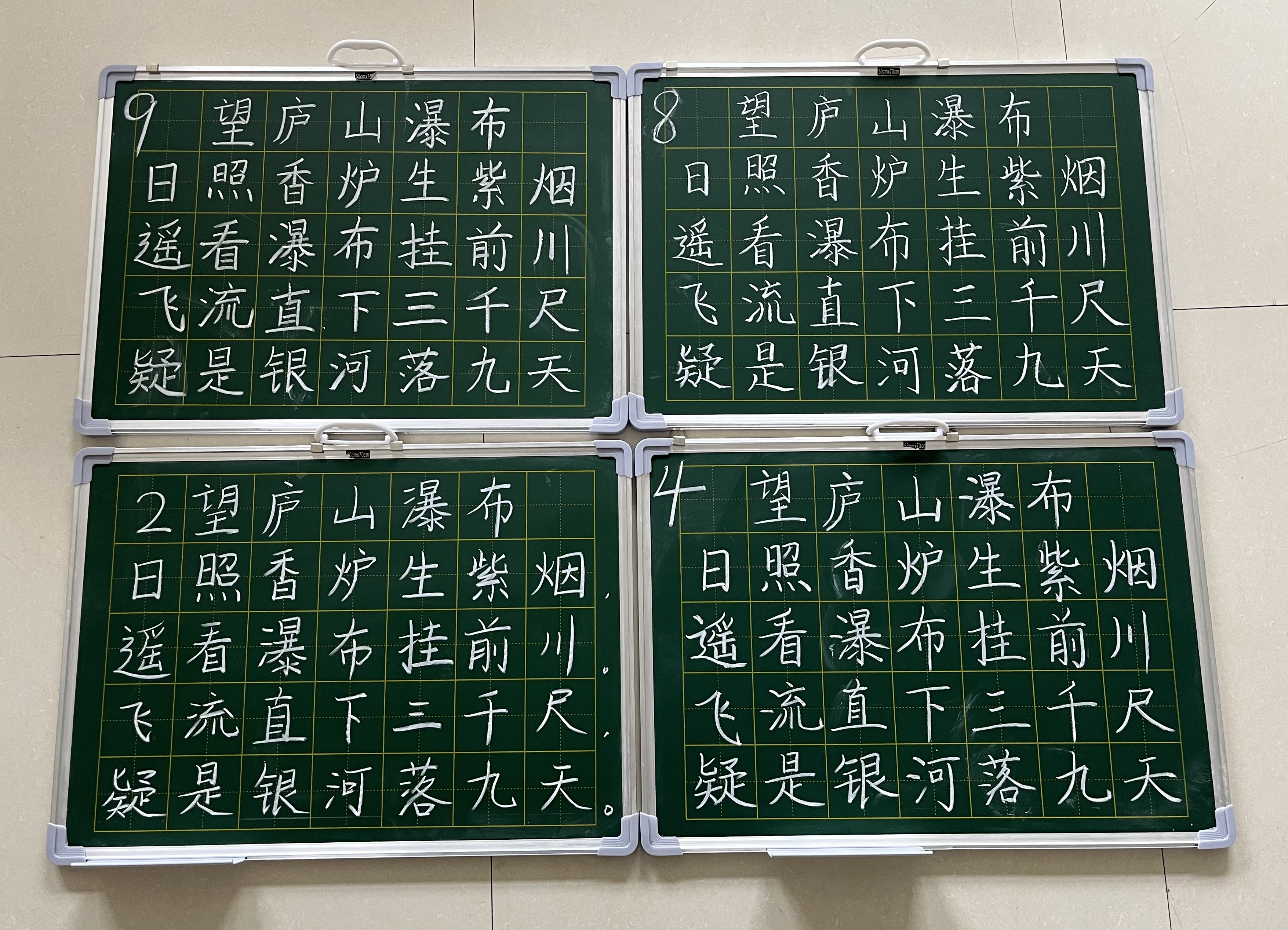 “三尺講臺育桃李,一支粉筆寫春秋”。一手漂亮的粉筆字是教師的基本素養(yǎng)。賽前老師們認(rèn)真練習(xí),賽中一筆一劃,盡顯規(guī)范。一塊黑板、一首古詩、一支粉筆,在他們手中輕舞飛揚, 一幅幅富有個性的作品展現(xiàn)在大家眼前,有的剛勁有力,有的大方得體,有的秀氣雋美,展示了備賽以來老師們的飛速進(jìn)步。