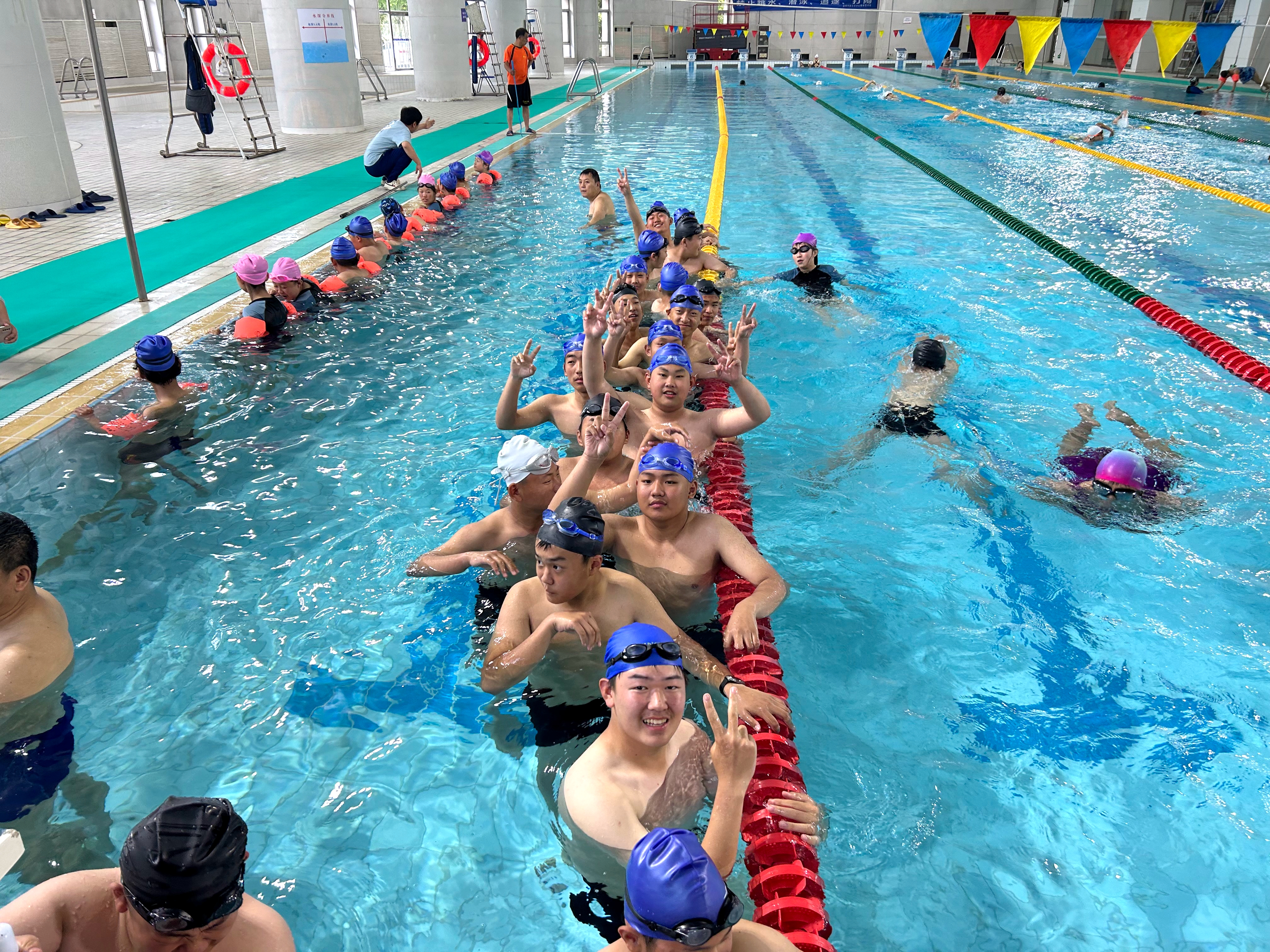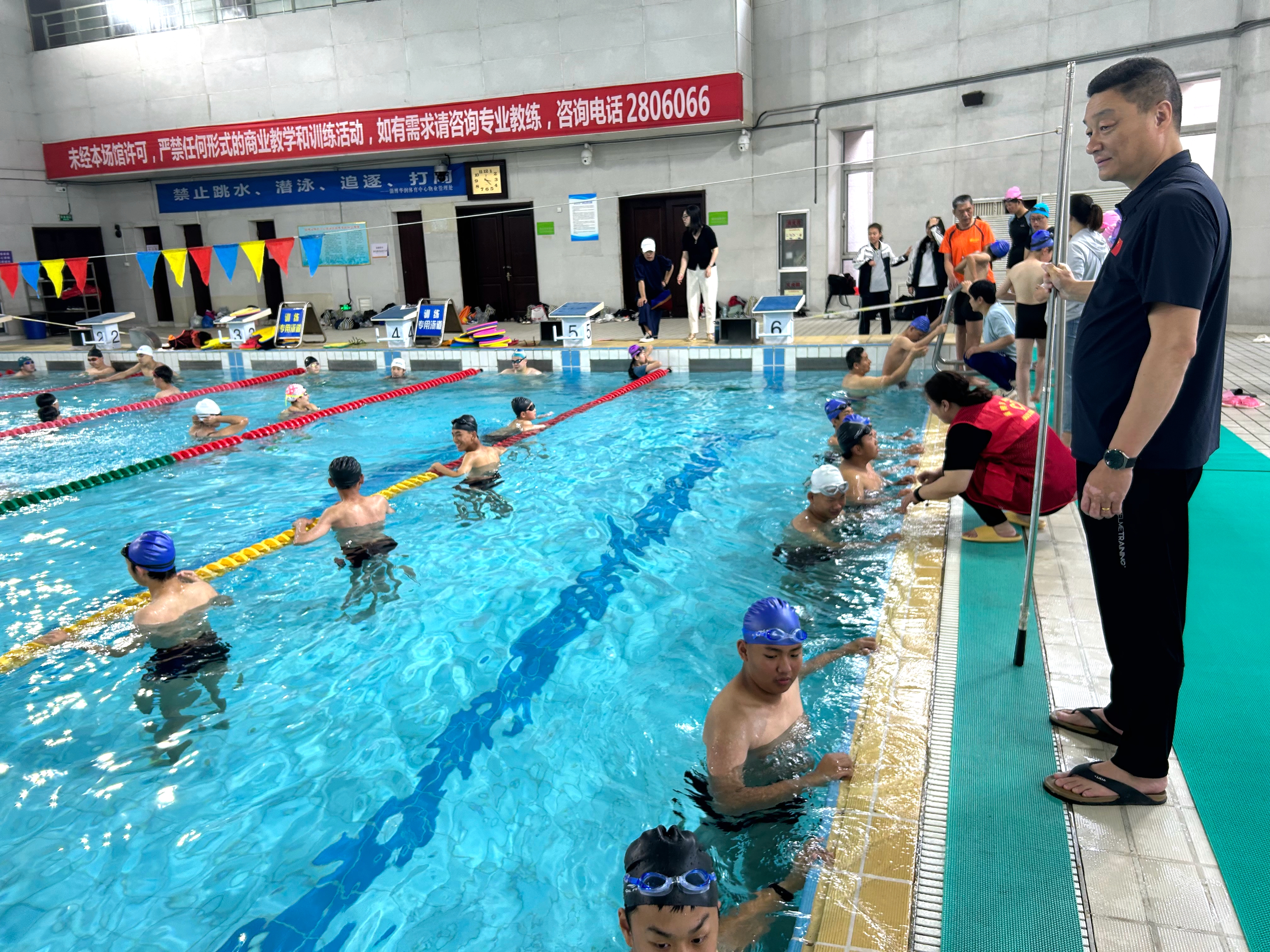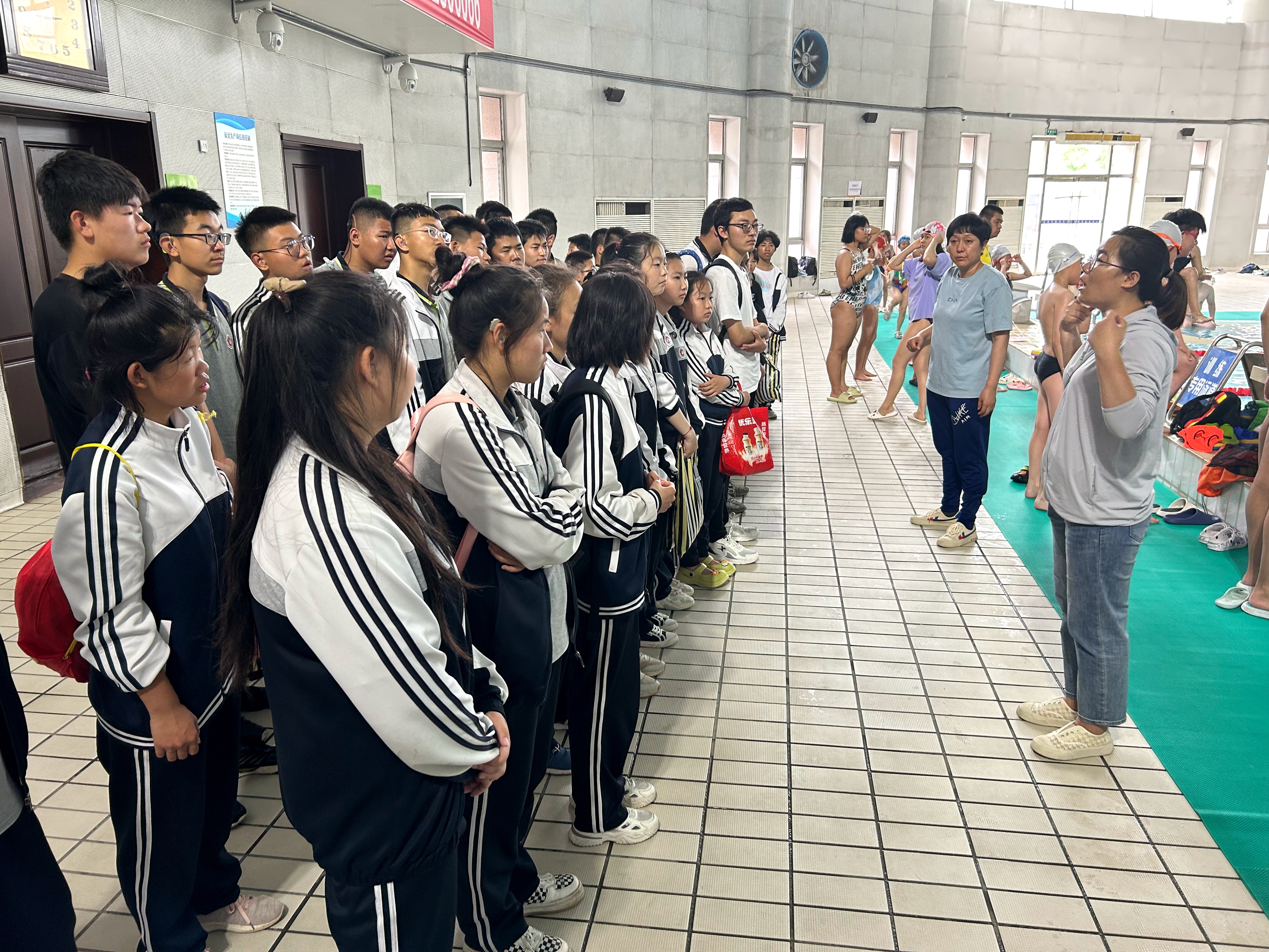 在志愿者和工作人員的引導(dǎo)下,同學(xué)們換好游泳裝備迅速在泳池邊集合,市體育中心的專業(yè)游泳教練帶領(lǐng)大家進(jìn)行了熱身活動(dòng)。