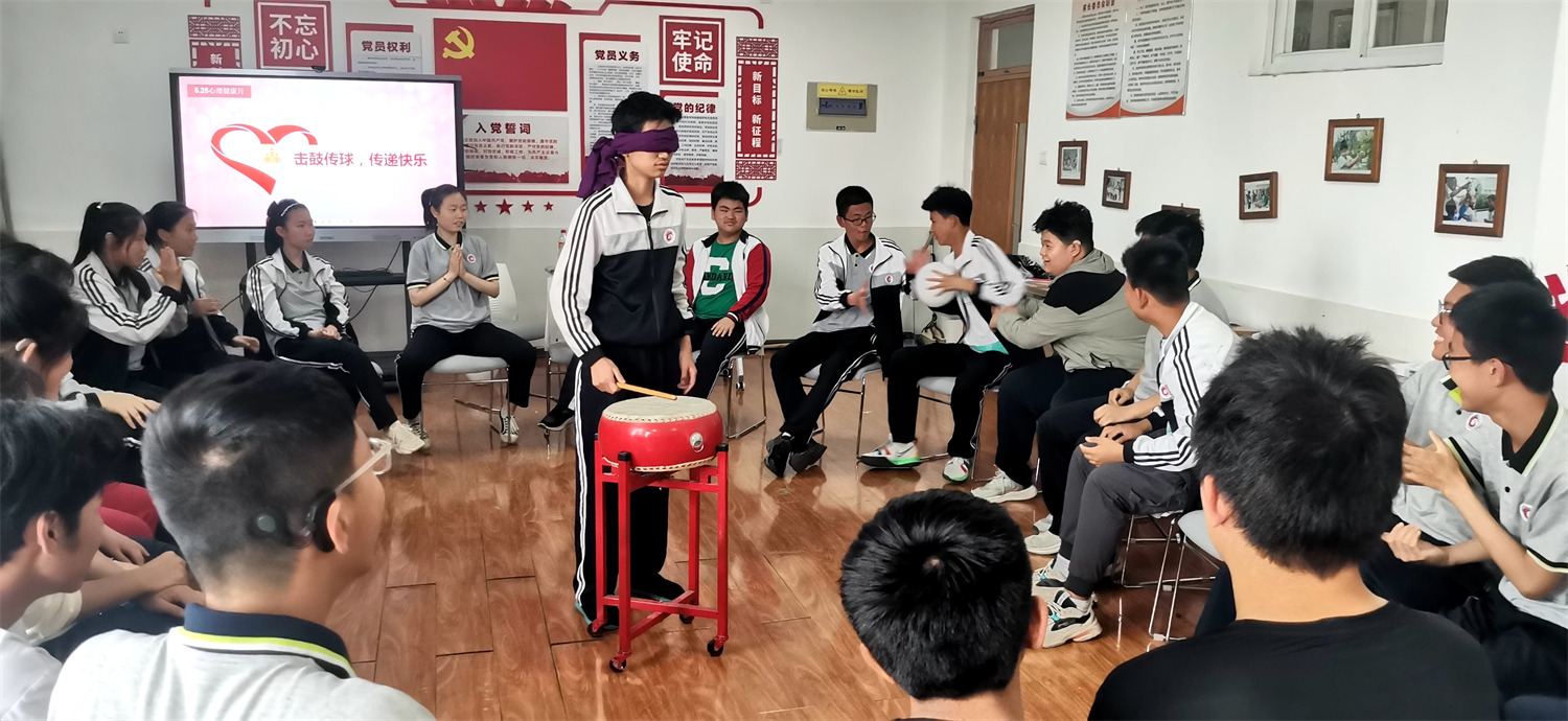 在咚咚作響的鼓聲中,氣球在同學(xué)們手中傳開。伴隨著鼓聲的愈演愈烈,同學(xué)們加快了傳遞的速度,鼓聲停止后,被傳中的同學(xué)有的表演才藝,有的分享快樂,有的傾訴煩惱,大家玩得不亦樂乎。在陣陣鼓聲中,同學(xué)們傳遞著快樂,打開了自己的內(nèi)心世界,獲得了更多的力量。