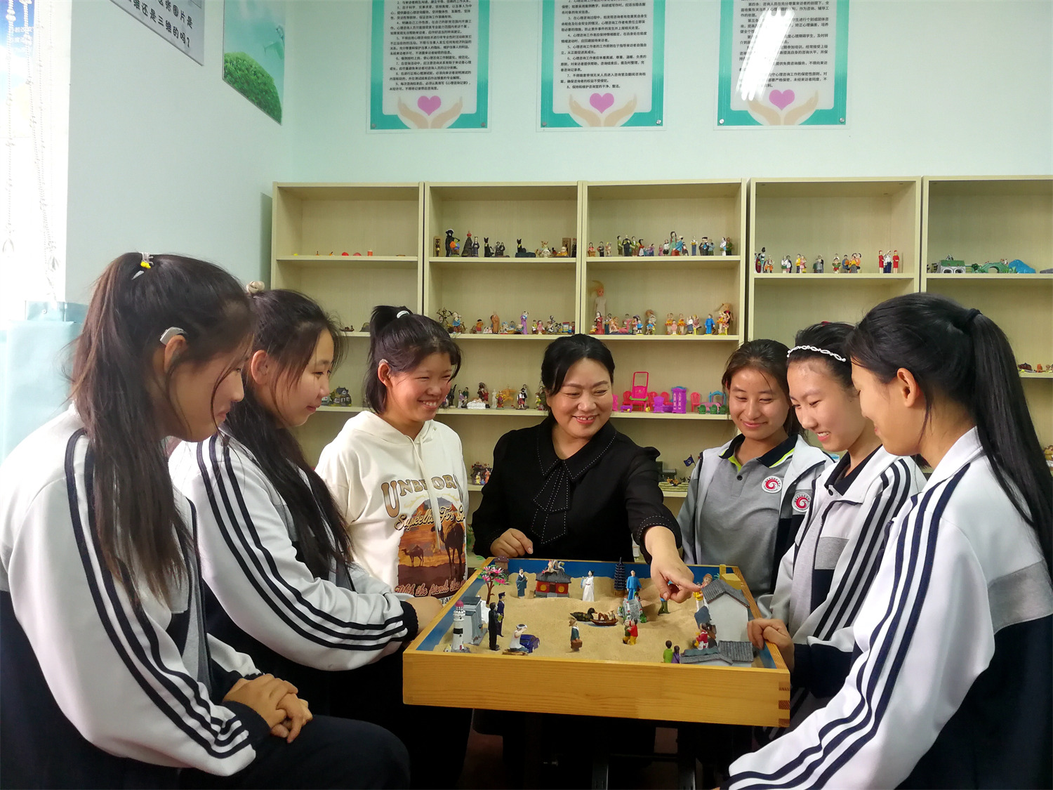 一沙一世界,同學(xué)們共同創(chuàng)作,默契配合,發(fā)揮想象力,在擺放過程中進行思維的碰撞,用沙子、沙具創(chuàng)造了欣欣向榮的美好小世界。通過對沙盤創(chuàng)作過程中心理活動的分享以及沙盤命名、故事創(chuàng)作等環(huán)節(jié),大家暢所欲言地表達自己,加深了交流,增強了團隊凝聚力。