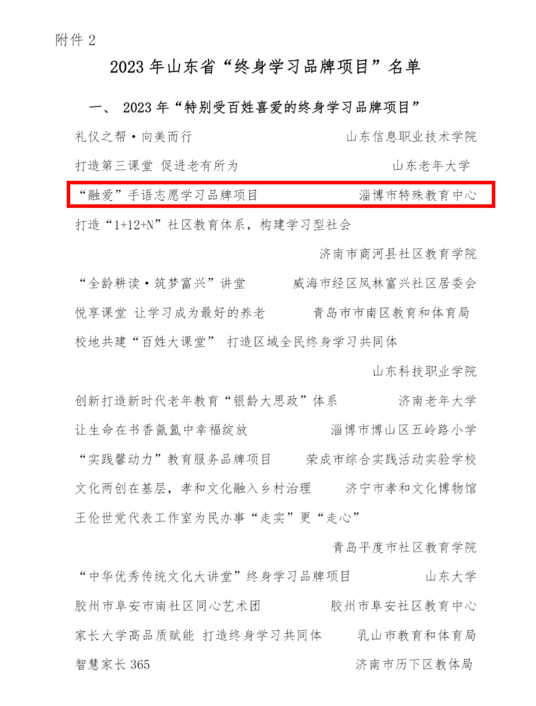 ??? 近日,山東成人教育協(xié)會公布了2023年山東省“百姓學習之星”和“終身學習品牌項目”名單,淄博市特殊教育中心“融愛”手語志愿學習品牌項目成功獲評山東省“特別受百姓喜愛的終身學習品牌項目”。