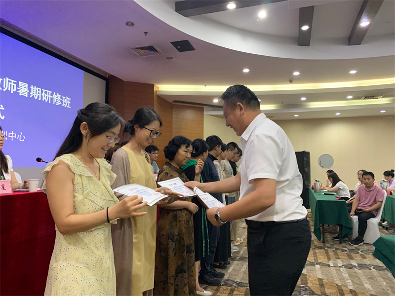 結(jié)業(yè)儀式上,丁寶龍希望參訓(xùn)老師能夠?qū)⑺鶎W(xué)知識(shí)內(nèi)化為實(shí)踐的能力,不斷提升自己,更好地為特殊兒童服務(wù)。賈益芹在講話中指出,此次培訓(xùn)是一次高水平、高質(zhì)量的培訓(xùn),參訓(xùn)教師在思想觀念、理論水平和業(yè)務(wù)能力上提升了一個(gè)新臺(tái)階。她向參訓(xùn)老師提出三點(diǎn)建議和希望:一是參訓(xùn)教師要把學(xué)習(xí)當(dāng)成一種自覺的生活狀態(tài),樹立終身學(xué)習(xí)的理念,向特教專家學(xué)習(xí),把他們作為前行的航標(biāo)。二是保持與時(shí)俱進(jìn)的精神狀態(tài),在特教發(fā)展的浪潮中勇于改變和創(chuàng)新,不斷超越自我、破浪前行。三是堅(jiān)持學(xué)以致用的原則。要從培訓(xùn)中找出自己工作的創(chuàng)新點(diǎn)、破解點(diǎn),改變陳舊的方式方法,讓培訓(xùn)有實(shí)效,讓改變看得見!最后,與會(huì)領(lǐng)導(dǎo)為參訓(xùn)教師代表頒發(fā)結(jié)業(yè)證書。