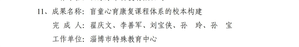 9月4日,淄博市總工會、淄博市科學(xué)技術(shù)局、淄博市人力資源和社會保障局公布《關(guān)于2023年全市職工創(chuàng)新創(chuàng)效競賽市級決賽創(chuàng)新成果的通報》,我校翟慶文教師團(tuán)隊《盲校心育康復(fù)課程體系的校本構(gòu)建》榮獲創(chuàng)新成果三等獎。此獎項(xiàng)面向全市各行各業(yè),經(jīng)過基層競賽選拔、推薦申報、資格審核、專家評審、綜合評價等程序,共有10項(xiàng)一等獎、20項(xiàng)二等獎、30項(xiàng)三等獎、40項(xiàng)優(yōu)秀獎創(chuàng)新成果,其中僅有2項(xiàng)成果來自中小學(xué),我校居其一。