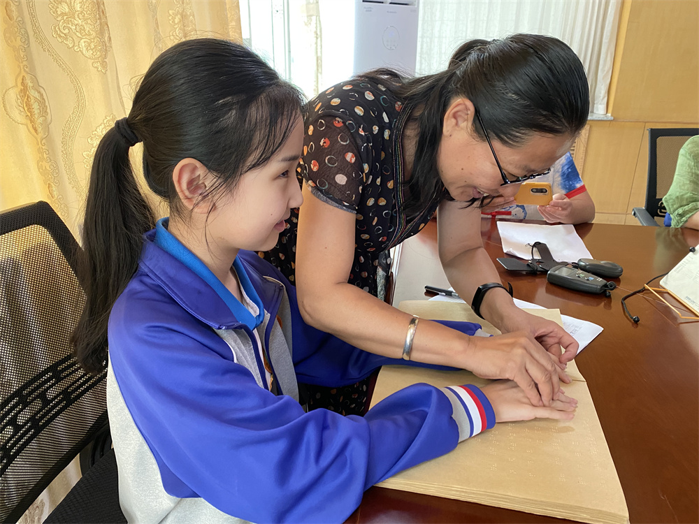 指導團隊首先就俊篪的學習狀況、座位安置、課程設(shè)置、無障礙設(shè)施環(huán)境等問題展開調(diào)研。通過充分訪談俊篪的任課教師、班級同學以及家長,了解到俊篪盲文接觸少的問題,在對她進行專業(yè)視力評估的基礎(chǔ)上,建議加強其盲文和信息技術(shù)課程的學習。盲文的學習是盲生獲取信息的重要渠道,信息技術(shù)的使用則可以幫助他們將學到的知識轉(zhuǎn)化為信息交流,一入一出,幫助他們打通社會交往的障礙。