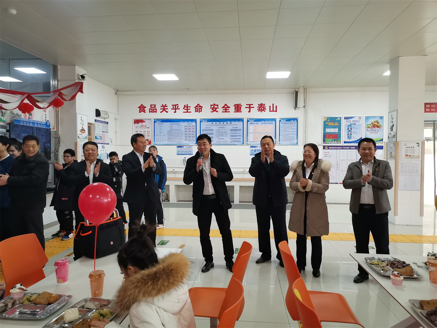 演出結(jié)束后,學(xué)校領(lǐng)導(dǎo)班子到食堂參加節(jié)日慶?;顒樱瑢筒蛶熒乱怨?jié)日的問候、送上美好祝愿。學(xué)校食堂提前籌劃活動,設(shè)計(jì)食譜、布置環(huán)境、營造節(jié)日氛圍,還為學(xué)校師生精心準(zhǔn)備節(jié)日蛋糕,祝愿生活甜如蜜,事事順心意。