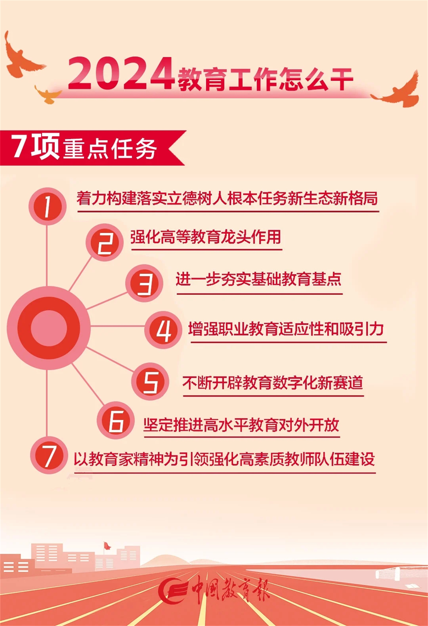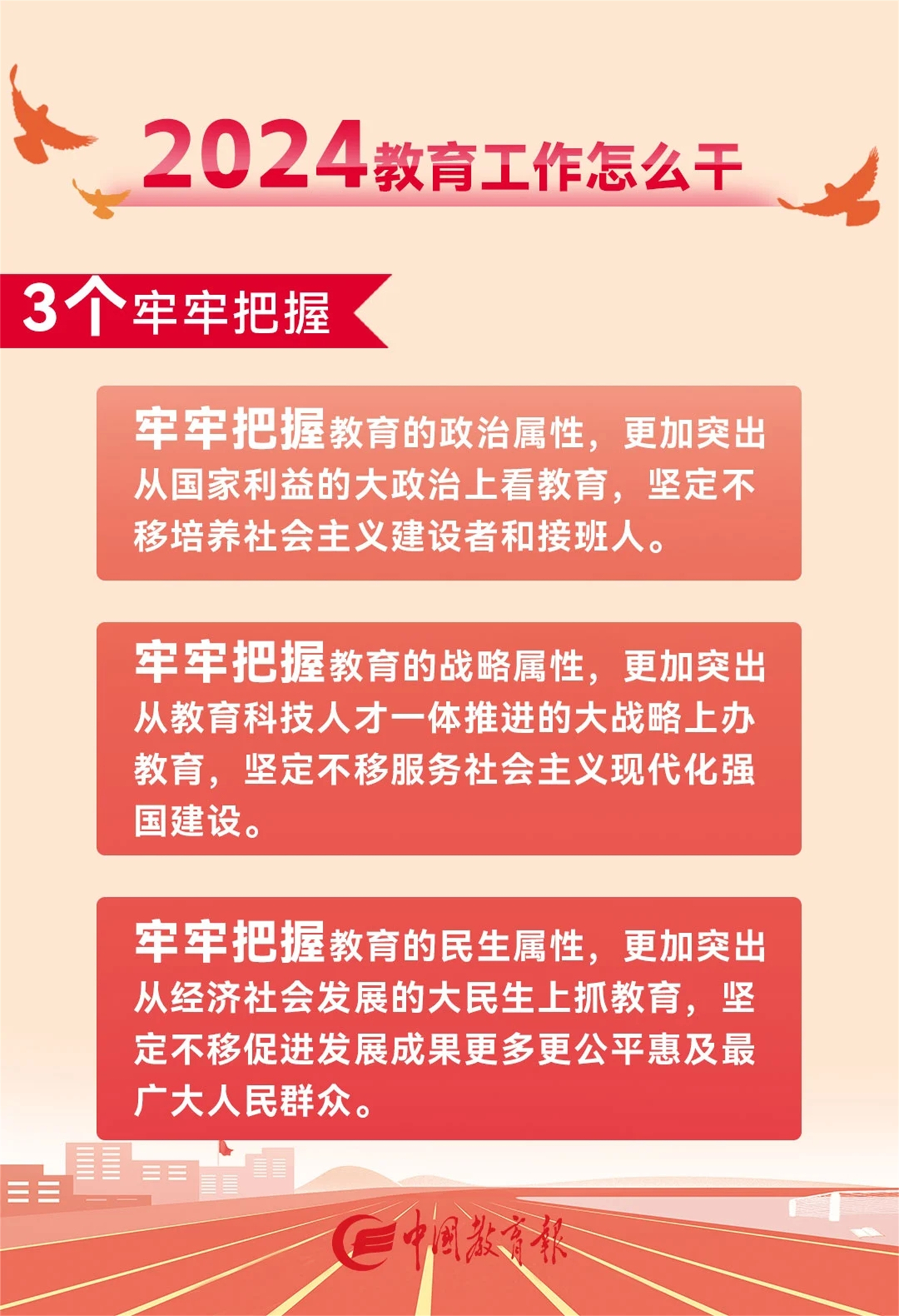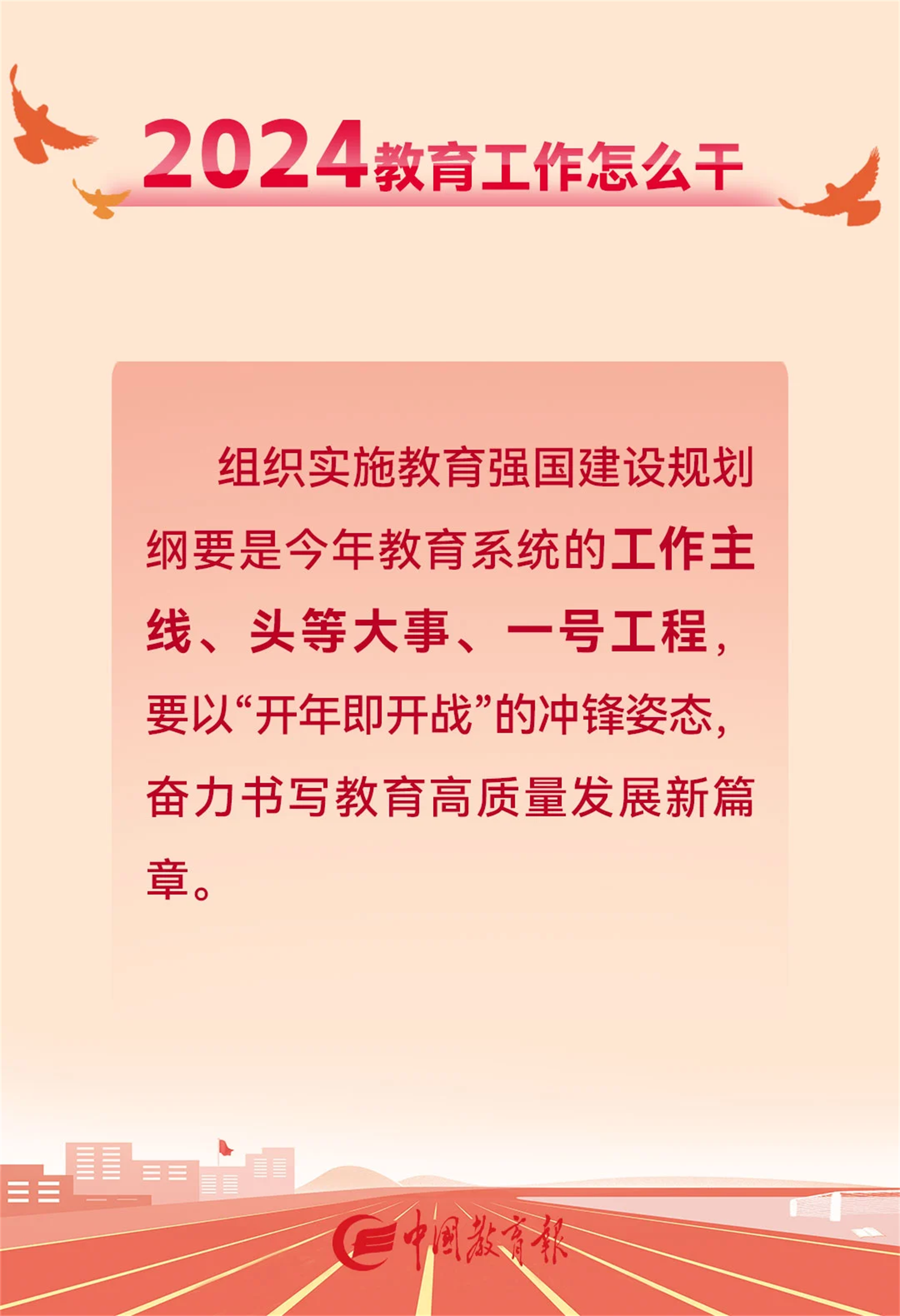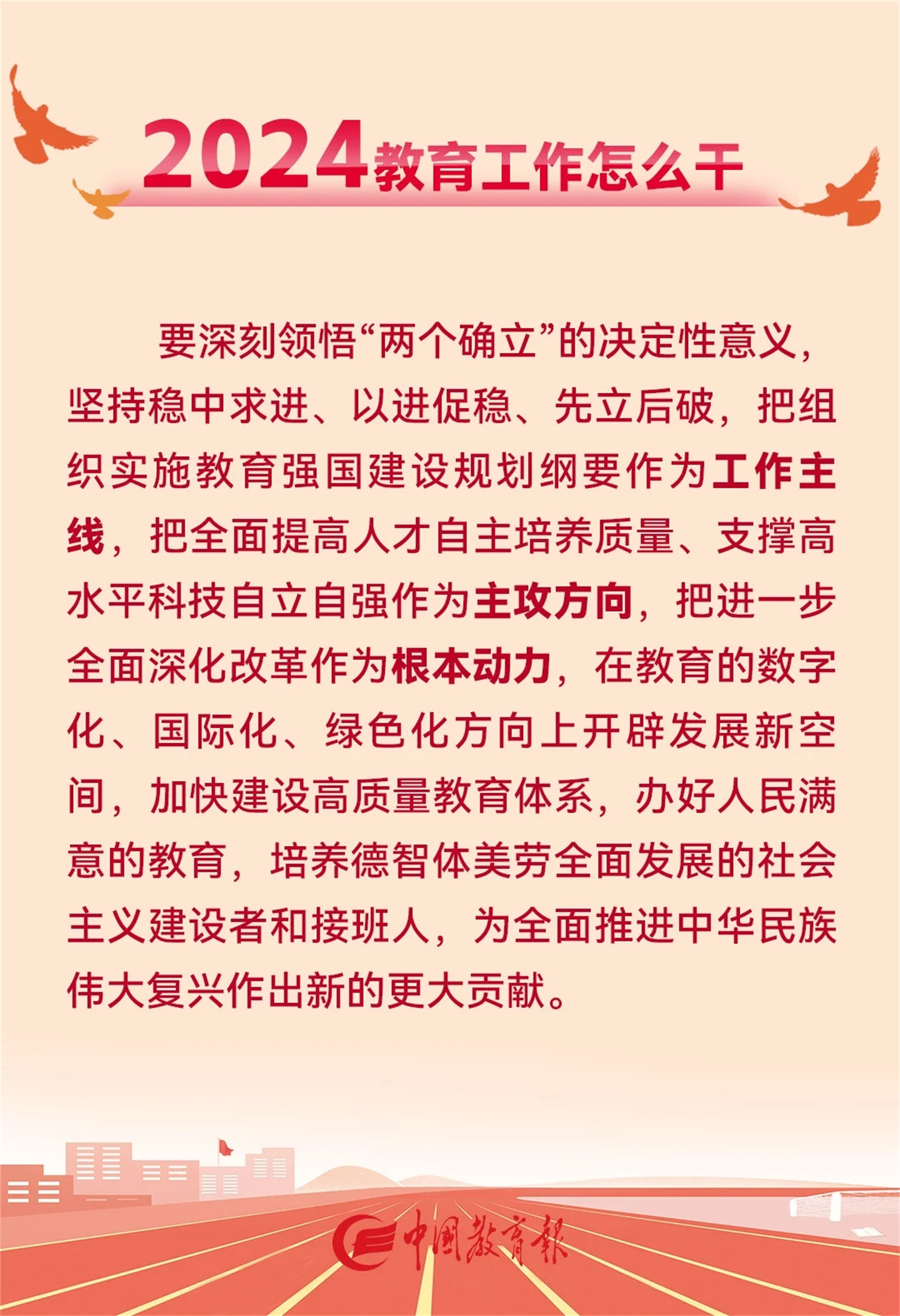 ?1月11日至12日,2024年全國教育工作會(huì)議在京召開。會(huì)議緊緊圍繞深入學(xué)習(xí)貫徹黨的二十大精神和習(xí)近平總書記在中央政治局第五次集體學(xué)習(xí)時(shí)的重要講話精神,是建設(shè)教育強(qiáng)國、推進(jìn)改革發(fā)展的部署會(huì)、交流會(huì)。一起來看會(huì)上說了啥——