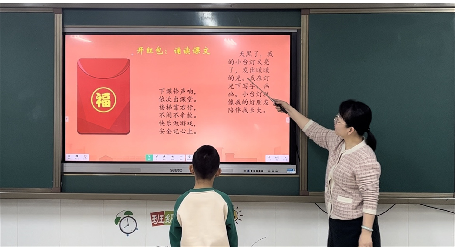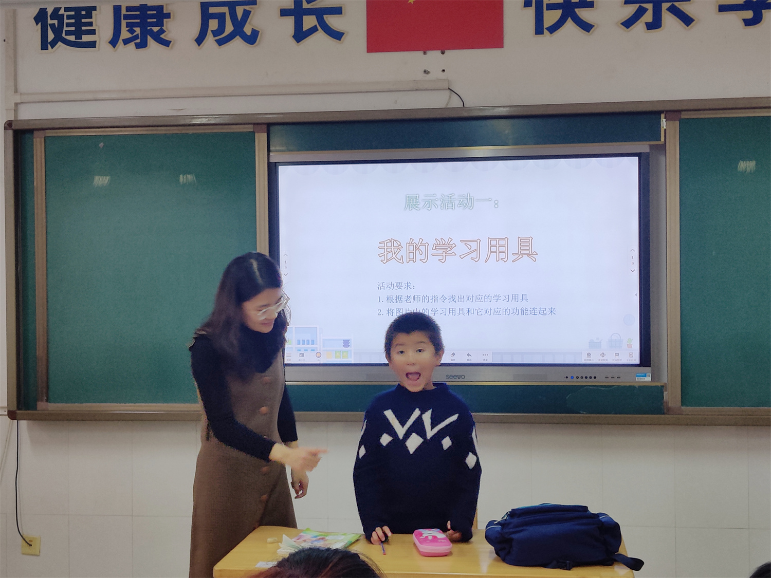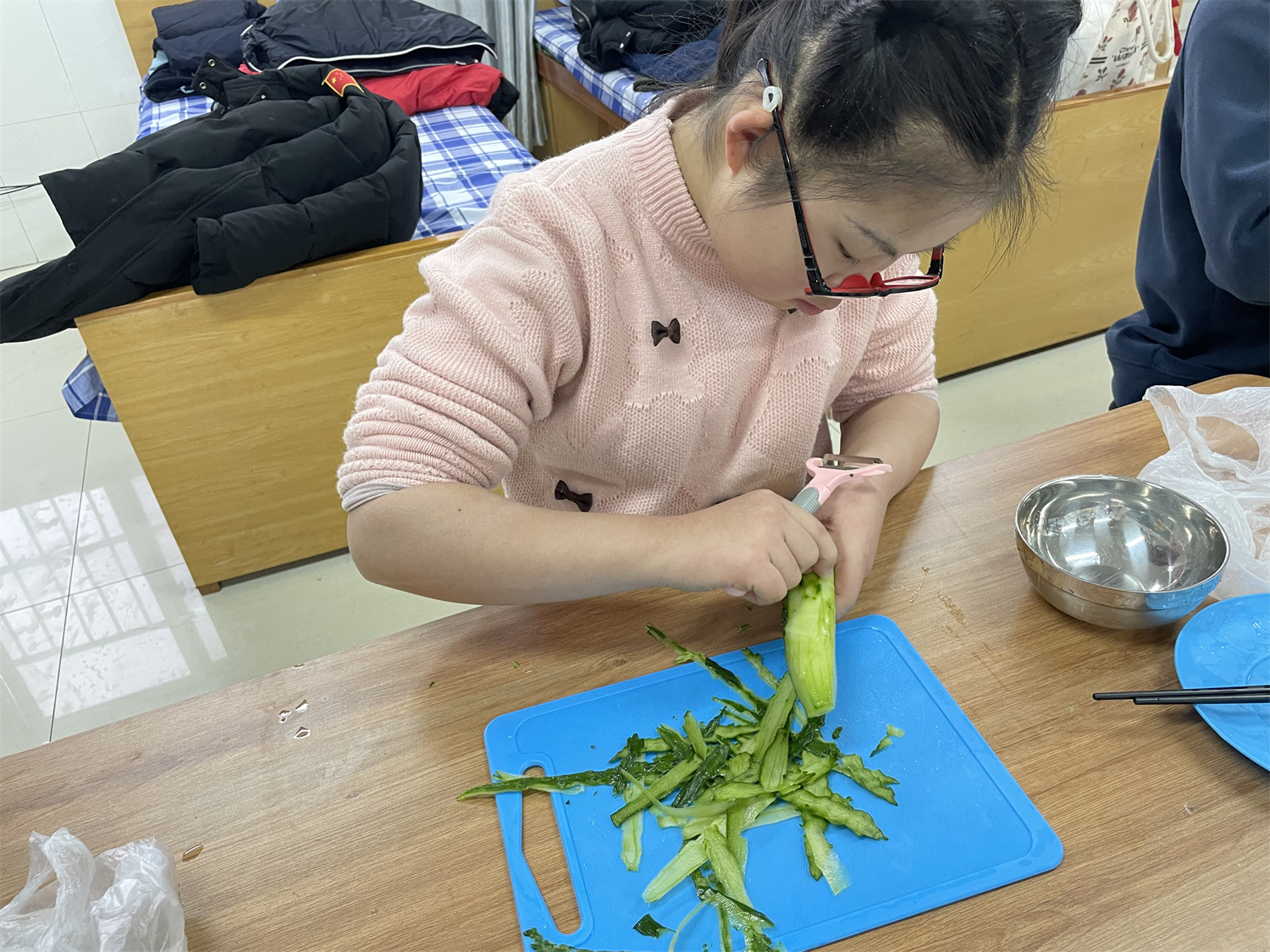 活動前,老師們共同商討、制定展示方案,精心準備教具,根據科目確定了不同的主題。展示時班級兩兩結對,互相加油鼓勁,取長補短、互促互學。生活語文學科圍繞“聽說讀寫”四方面,以闖關形式進行展示,同學們一路闖過字詞關、句子關和課文關,順利通關。生活數學學科的展示上,老師們將數學知識融入到新年的元素中,學生通過隨機抽取的方式選擇題目作答。生活適應學科的展示主題是“亮出我的絕活”,學生將本學期學會的生活技能通過游戲的方式展示2-3項內容。勞動技能學科在操作室進行,每位學生完成了一道自己的拿手菜,和家長們吃得有滋有味。