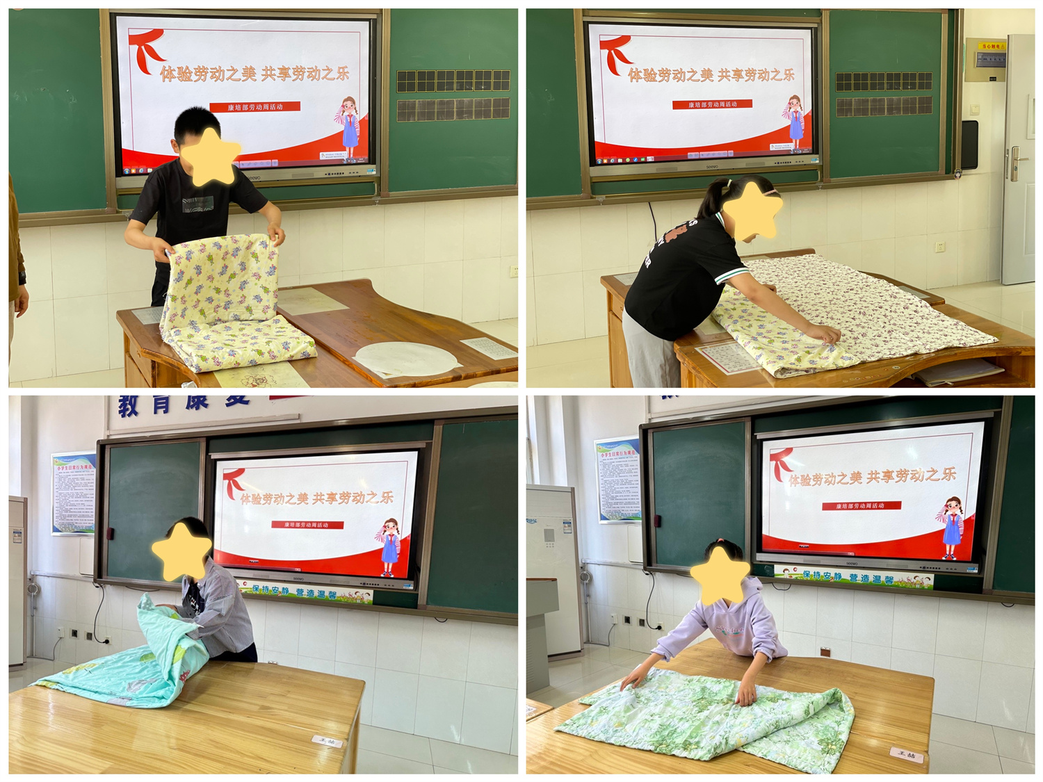 學(xué)生們根據(jù)不同年級分配了不同的勞動任務(wù)。看,低年級的同學(xué)在展示使用勺子、收拾書包和疊被子。孩子們年齡雖小,動作卻快,在老師的鼓勵聲中,孩子們體會到了勞動的樂趣。中高年級的同學(xué)展示套被罩、卷襪子、疊衣服,幫家人分擔(dān)家務(wù)活的辛苦。孩子們動作嫻熟,有條不紊,不一會兒家務(wù)就做好了。各班召開了勞動教育主題班會,講述勞動模范的故事,并根據(jù)同學(xué)們的展示,在班內(nèi)評比了勞動小明星,不僅激發(fā)了學(xué)生們熱愛勞動的感情,更懂得了生活離不開勞動,應(yīng)該感恩家人、老師和建設(shè)祖國的勞動者們。