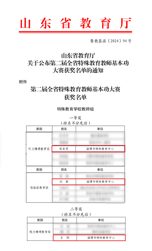 ?近日,山東省教育廳發(fā)布《關(guān)于公布第二屆全省特殊教育教師基本功大賽獲獎(jiǎng)名單的通知》(魯教基函〔2024〕94號),淄博市特教中心教師憑借卓越的專業(yè)素養(yǎng)與教學(xué)實(shí)力,斬獲佳績。其中程亞男老師獲聽障組一等獎(jiǎng),劉新老師獲孤獨(dú)癥組一等獎(jiǎng),王陽老師獲視障組二等獎(jiǎng)。