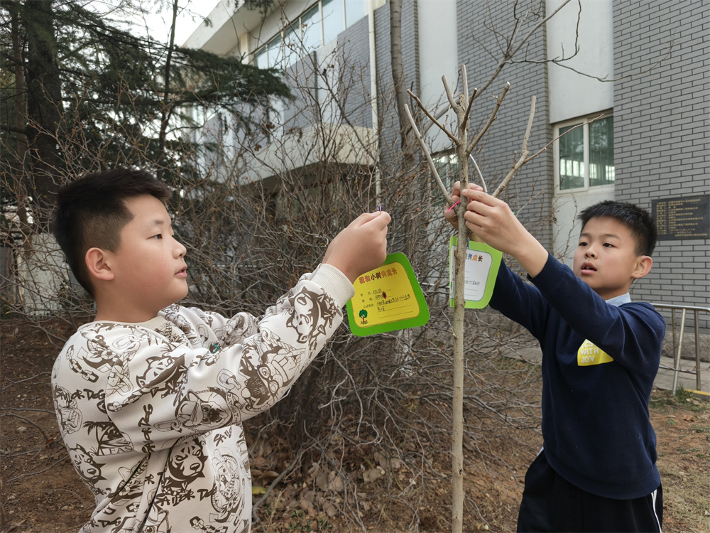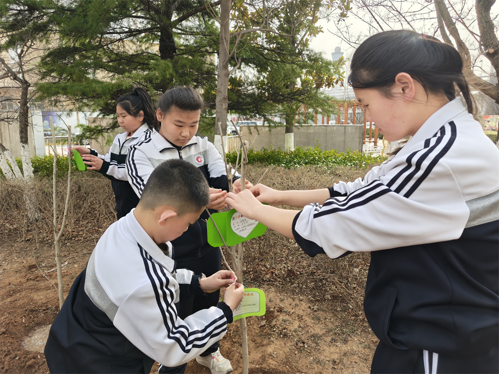 活動(dòng)結(jié)束后,學(xué)生們紛紛在自己種下的小樹上掛上了植物名牌和心愿卡,期待未來與綠意共成長,并一起約定:要像照顧自己的朋友一樣,定期為小樹澆水、施肥,和小樹一起成長,一起見證彼此的進(jìn)步。