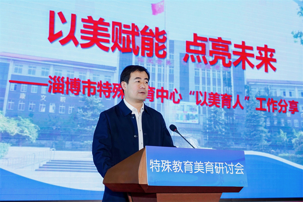 研討會上,學(xué)校被確立為首批“特殊教育美育實踐基地”。吳明剛以《美育賦能 點亮未來》為主題,從美育課程、美育資源、美育平臺、美育品牌等方面,向全國特教同仁分享了“以美育人”工作創(chuàng)新實踐的“淄特經(jīng)驗”和“淄特成效”,贏得了與會專家和同行的高度贊譽。