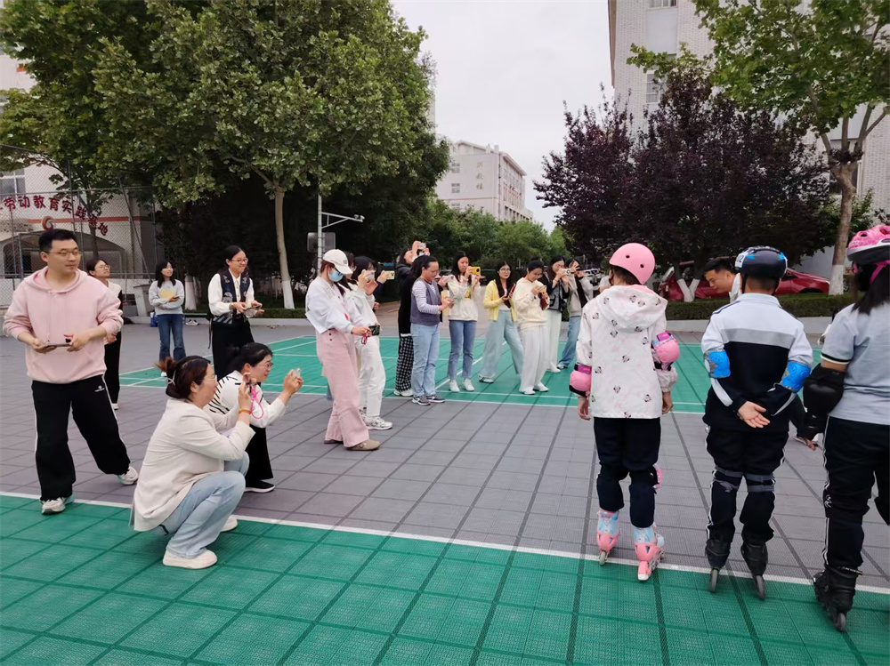 理論講解后,王兵老師帶領(lǐng)參訓(xùn)人員走進(jìn)實(shí)踐環(huán)節(jié)。恰逢學(xué)校輪滑社團(tuán)活動(dòng),王老師以“動(dòng)態(tài)抓拍”為主題,現(xiàn)場示范如何通過預(yù)判動(dòng)作、調(diào)整快門速度、捕捉光影變化等方式定格精彩畫面。青年教師們紛紛拿起相機(jī),嘗試從不同角度記錄學(xué)生矯健的身姿、專注的神情,以及師生互動(dòng)的溫馨場景。