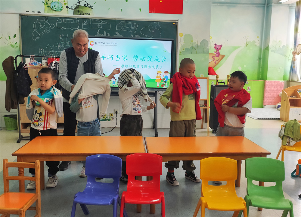 在啟智小班教室里,小朋友齊聚一堂按班級(jí)順序展示了穿衣服、掛衣服、使用勺子等生活技能,孩子們的動(dòng)作稚嫩而認(rèn)真,獲得了觀眾們的陣陣掌聲。在博愛(ài)禮堂內(nèi),義務(wù)段學(xué)生的展示項(xiàng)目更是豐富多樣:系紅領(lǐng)巾、縫扣子、掃地、擦桌子、打包物品、系圍裙……孩子們手法嫻熟,細(xì)心專注,驕傲地展示著自己在勞動(dòng)課的學(xué)習(xí)成果。