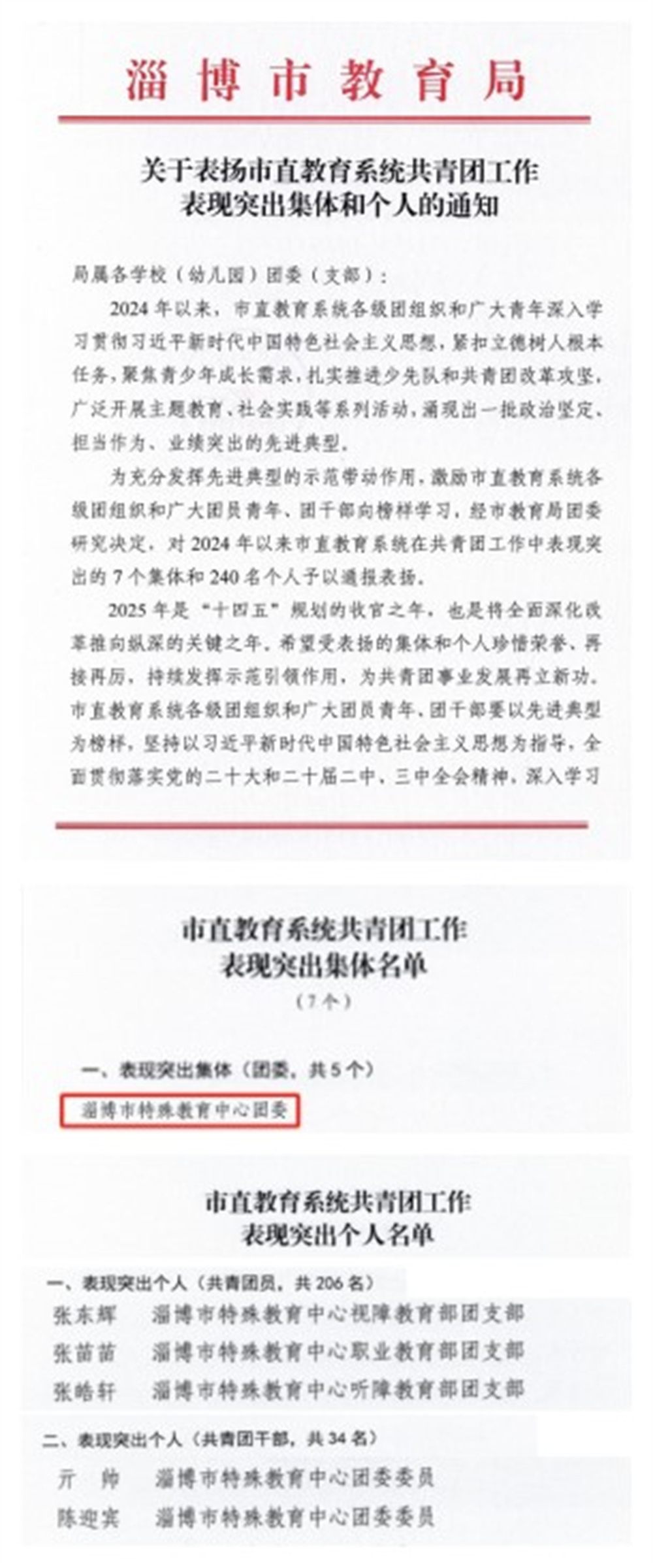 ???近日,淄博市教育局印發(fā)《關(guān)于表?yè)P(yáng)市直教育系統(tǒng)共青團(tuán)工作表現(xiàn)突出集體和個(gè)人的通知》,淄博市特教中心團(tuán)委榮獲“共青團(tuán)工作表現(xiàn)突出集體”稱號(hào);陳迎賓、亓帥兩名教師獲評(píng)“表現(xiàn)突出共青團(tuán)干部”;張東輝、張苗苗、張皓軒三名同學(xué)獲評(píng)“表現(xiàn)突出共青團(tuán)員”。