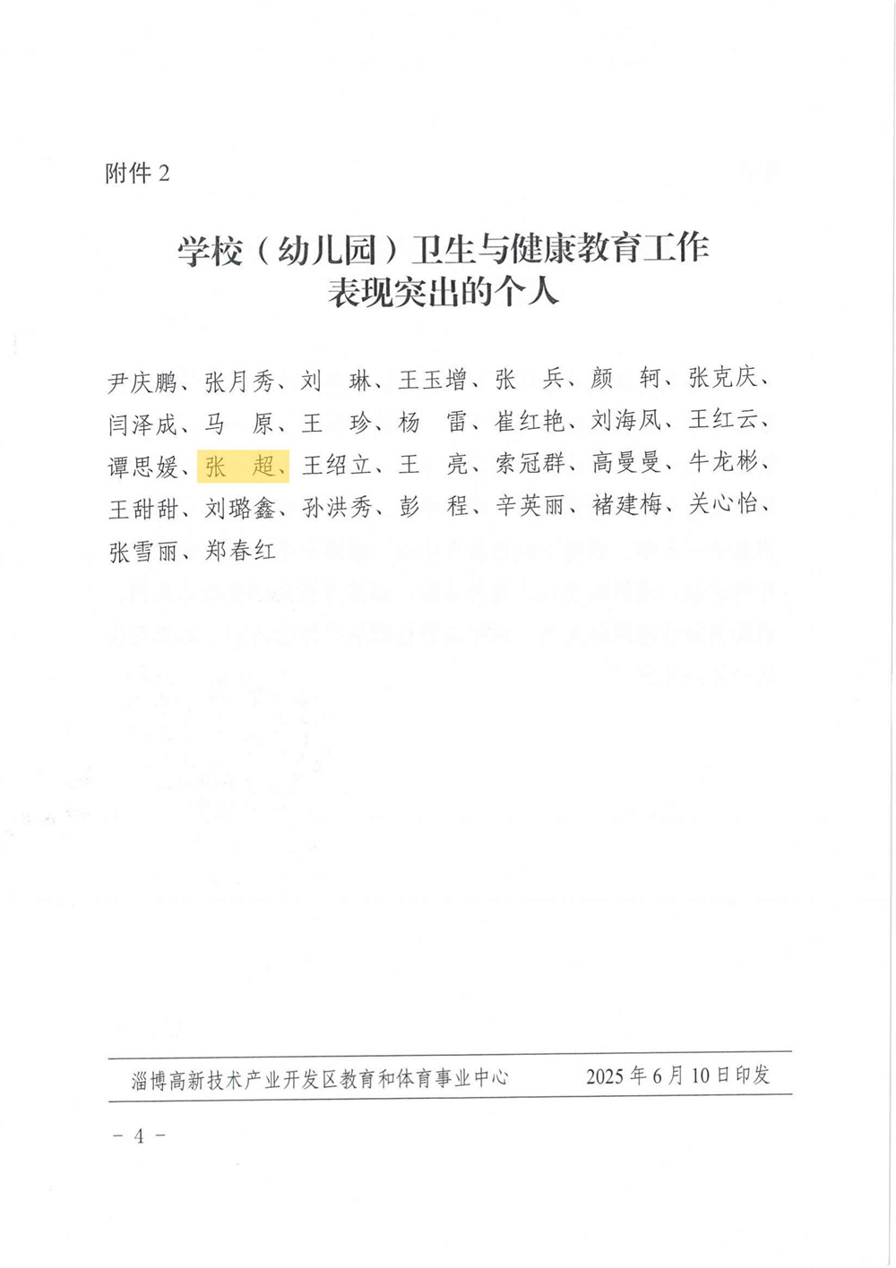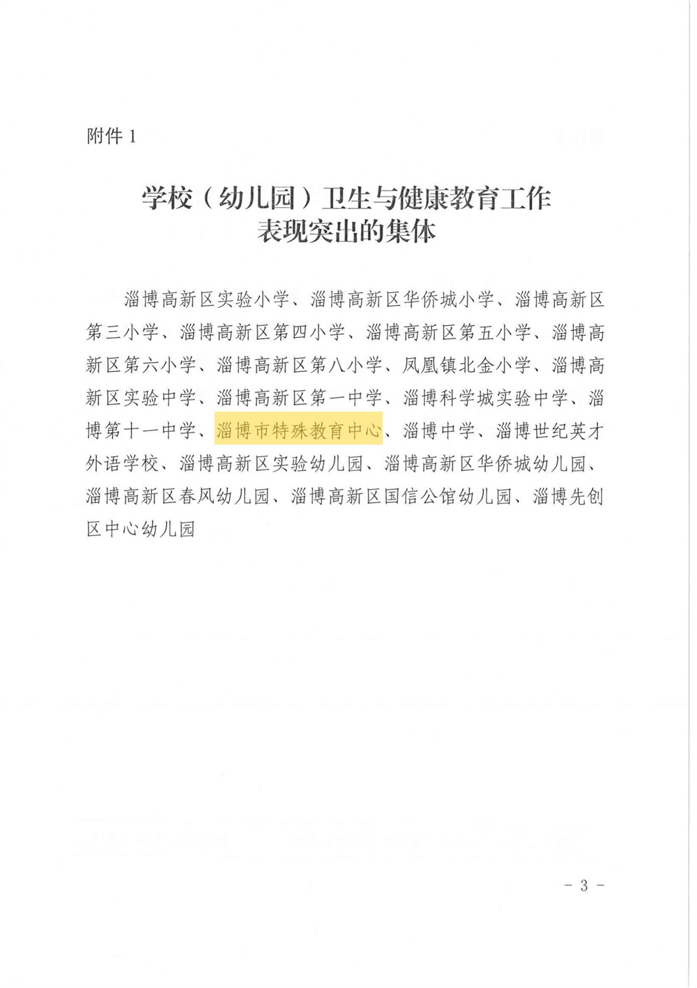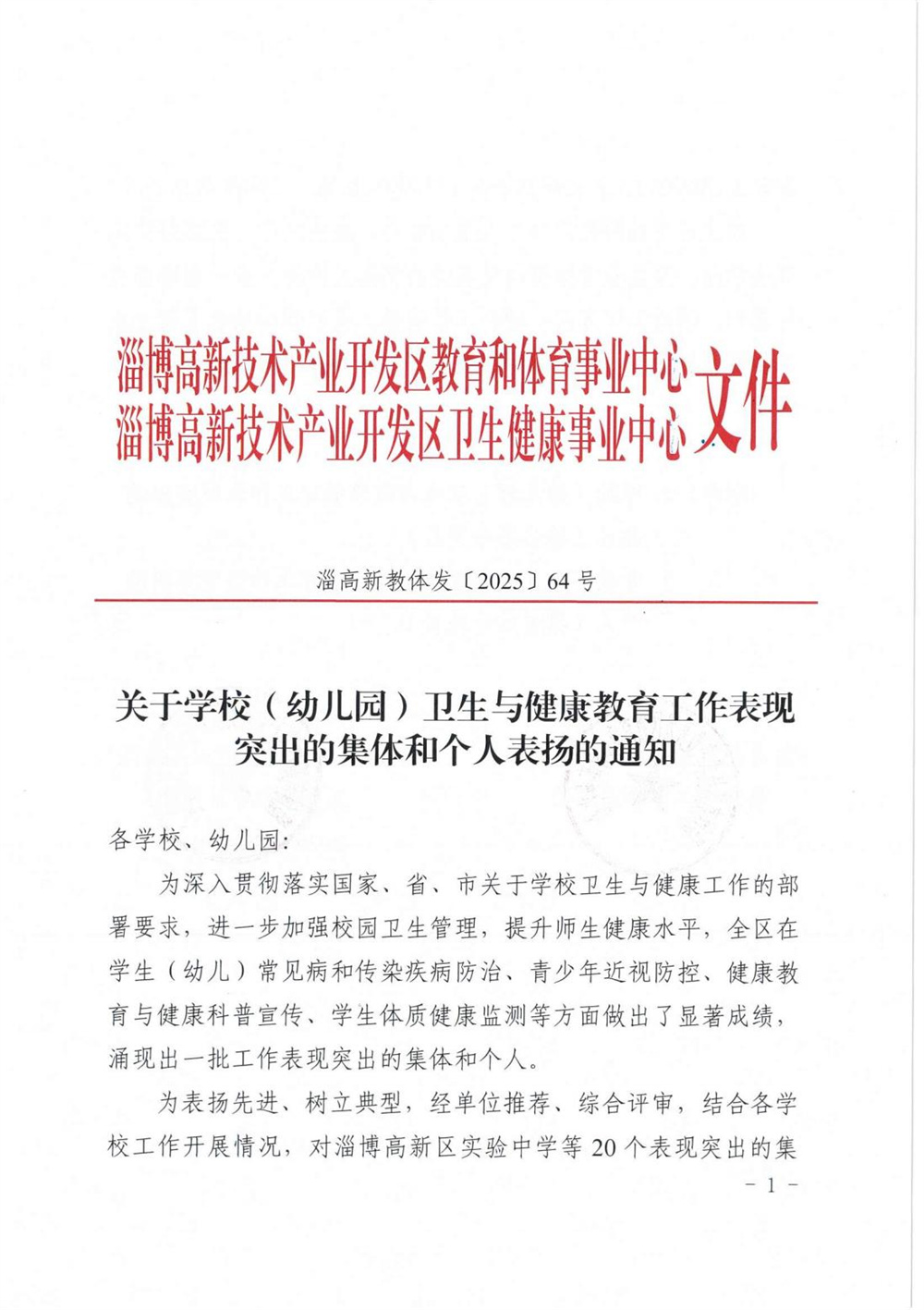 ?近日,淄博高新技術產業(yè)開發(fā)區(qū)教育和體育事業(yè)中心發(fā)布《關于學校(幼兒園)衛(wèi)生與健康教育工作表現(xiàn)突出的集體和個人表揚的通知》,我校被評選為“表現(xiàn)突出集體”,校醫(yī)張超被評選為“表現(xiàn)突出個人”。