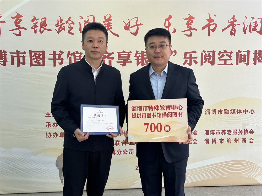 ?近日,淄博市圖書館“齊享銀齡”樂閱空間揭牌儀式隆重舉行。淄博市特教中心黨委委員、紀委書記翟冉受邀出席活動,代表學(xué)校向淄博市圖書館提供700冊大字版書籍。這些書籍字體清晰、類目豐富,為視障群體、老年讀者等搭建起無障礙閱讀的橋梁;淄博市圖書館學(xué)會理事長、淄博市圖書館黨支部書記、館長黃磊接受借閱書籍并向淄博市特教中心頒發(fā)收藏證書,彰顯了學(xué)校在推進公共文化服務(wù)均等化、助力無障礙閱讀生態(tài)建設(shè)中的突出貢獻。